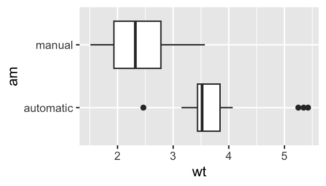 # a boxplot of weight vs transmission; this figure# will be placed in the marginggplot(mtcars2, aes(am, wt)) +geom_boxplot() +coord_flip()