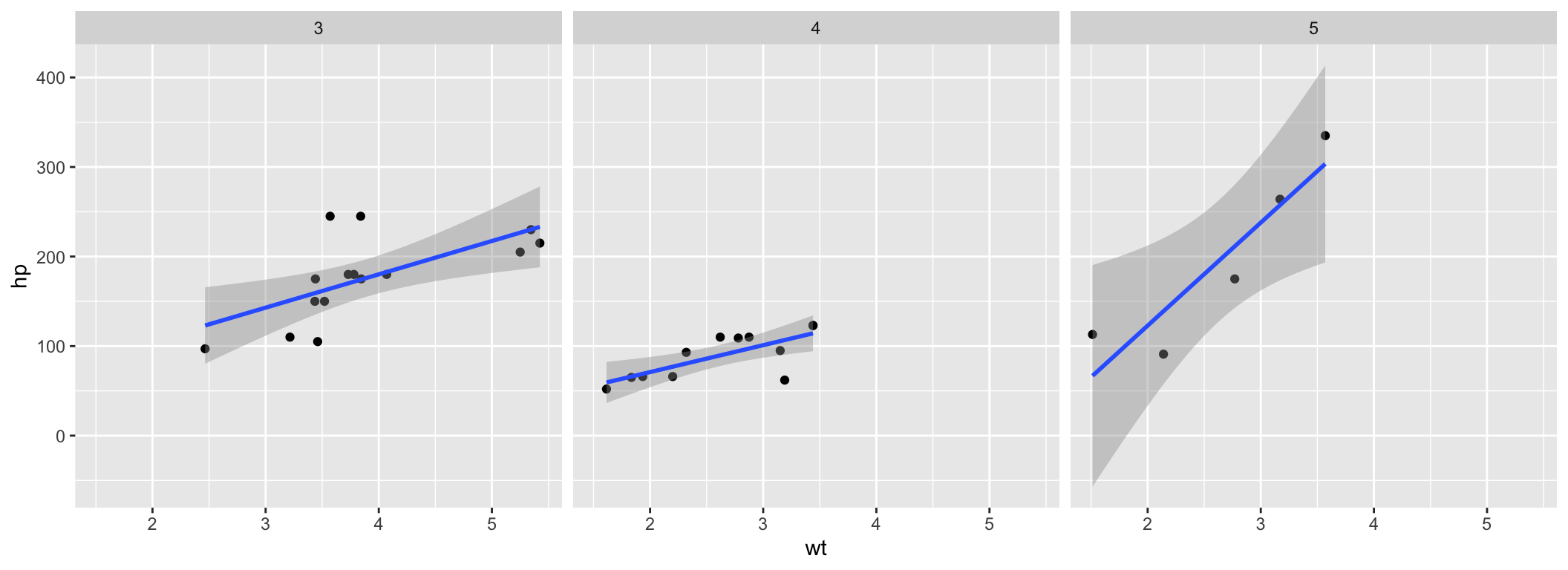 # a fullwidth figurep +geom_smooth(method ='lm') +facet_grid(~ gear)